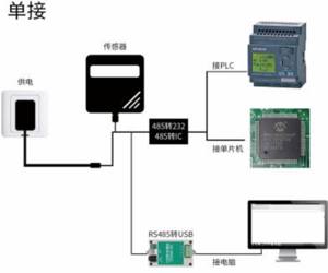 本产品也可以多个传感器组合在一条485总线使用,理论上一条总线可以接253个485传感器,另一端接入带有485接口的PLC、通过485接口芯片连接单片机,或者使用USB转485即可与电脑连接,使用我公司提供的传感器调试软件进行配置和测试(在使用该配置软件时只能接一台设备)。